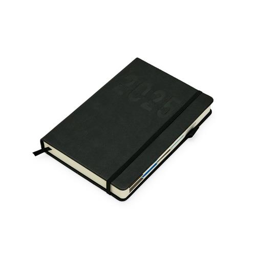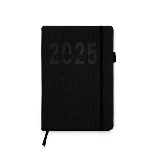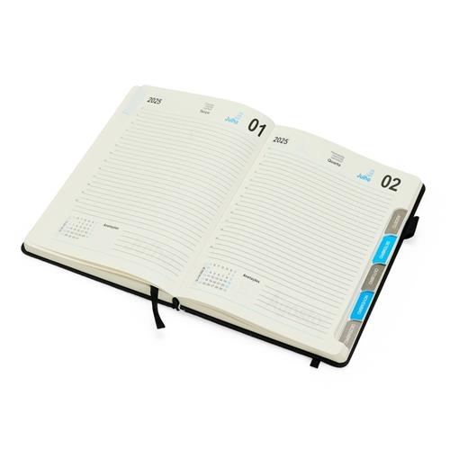 Agenda Diária 2025 com divisórias e suporte para caneta. Possui capa de PU macia, fita de cetim como marcador de página, elástico para lacre, seção para dados pessoais, calendário de 2024 a 2027, conversões de medidas, planejador mensal de 2025 a 2026, índice telefônico, informações de ligações DDD-DDI e discagem direta internacional DDI.