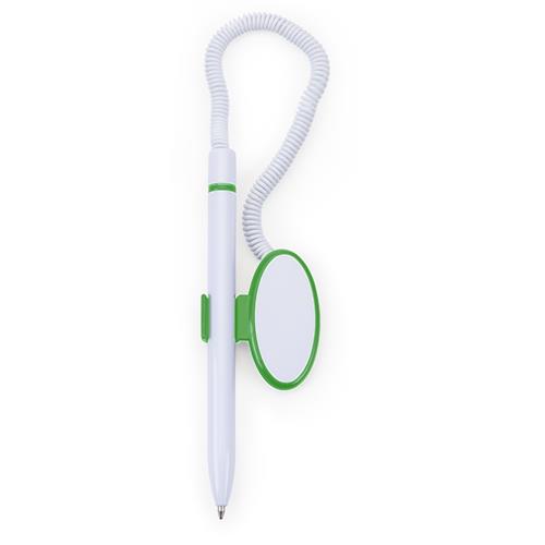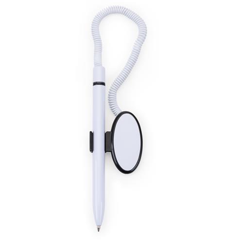 Caneta balcão plástica com suporte e adesivo auto colante. Carga esferográfica azul.